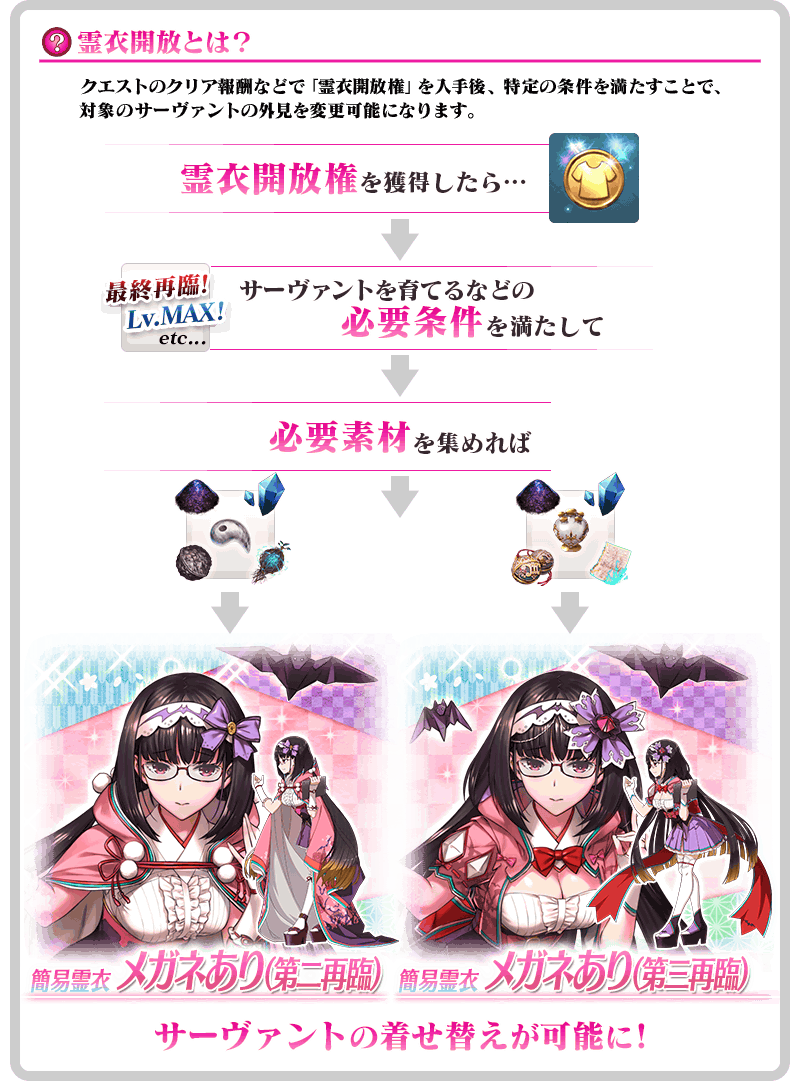 ※「霊衣縫製」に追加される簡易霊衣「メガネあり(第二再臨)」「メガネあり(第三再臨)」の開放権は恒常となり、交換期限はありません。 ※対象の霊衣開放権の対象サーヴァントを未所持の場合、霊衣開放権の入手はできますが、霊衣開放はおこなえませんのでご注意ください。 ※「★5(SSR)刑部姫(アサシン)」の霊衣「メガネあり(第二再臨)」「メガネあり(第三再臨)」は外見のみ変化し、ボイスは変化しない「簡易霊衣」です。