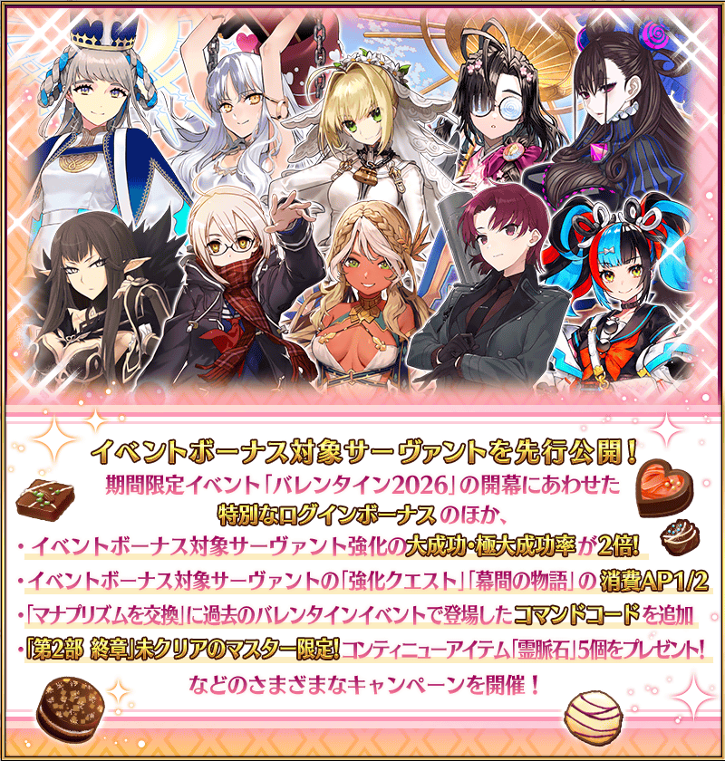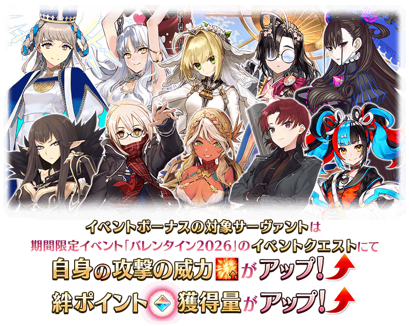 期間限定イベント「バレンタイン2026」の期間中、一部のサーヴァントはイベントクエストにおける「自身の攻撃の威力がアップ」と「絆ポイント獲得量がアップ」のボーナスを得られます!