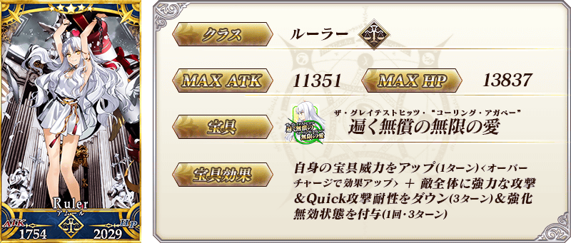 ◆最大解放時効果◆ 自身のQuickカード性能を15%アップ&Artsカード性能を15%アップ&HP回復量を30%アップ |