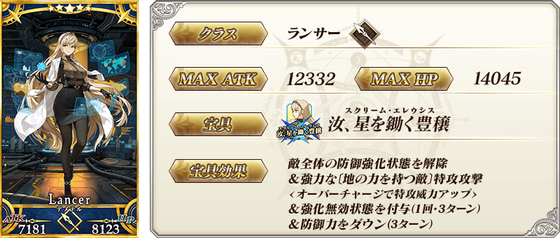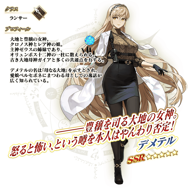 ※上記の「★5(SSR)デメテル」のイラストとセイントグラフは霊基再臨第2段階のものです。 ※「★5(SSR)デメテル」の宝具は再臨段階によって名称と演出が変化いたします。