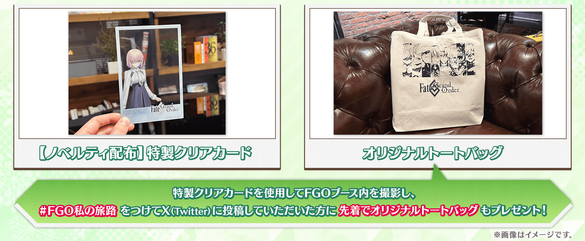 特製クリアカードを使用してFGOブース内を撮影し、ハッシュタグ「#FGO私の旅路」をつけてX(Twitter)に投稿していただいた方に、先着でオリジナルトートバッグもプレゼントいたします。
