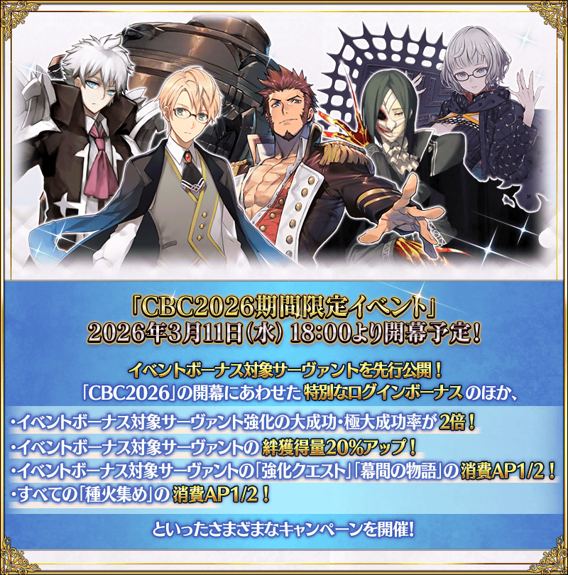 ※2026年3月11日(水) 18:00より開幕予定の「CBC2026期間限定イベント」では、フリークエストはありません。 ※対象のサーヴァントとなっていても、本イベントのメインシナリオに登場しない場合があります。 ※「★5(SSR)魔王信長(織田信長)」は「★5(SSR)織田信長」を霊基再臨第3段階にすることで名称が「★5(SSR)魔王信長」に変化します。 ※イベントボーナスの効果量はサーヴァントによって異なります。 ※3月6日(金) 18:00より、サーヴァント選択画面やサーヴァント強化画面などに、イベントボーナスフィルターが追加されております。イベントで活躍するサーヴァントのみを表示する便利な機能となりますので、こちらもあわせてご活用ください。