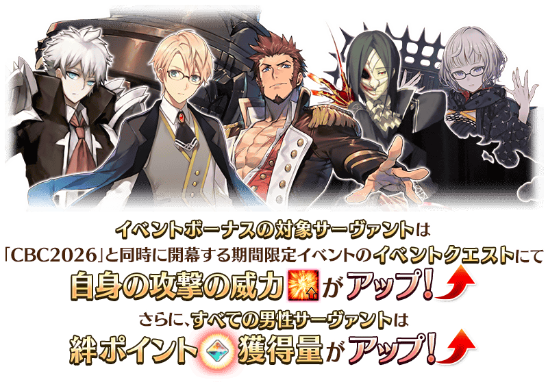 「CBC2026」と同時に開幕する期間限定イベントの期間中、一部のサーヴァントはイベントクエストにおける「自身の攻撃の威力がアップ」のボーナスを得られます!