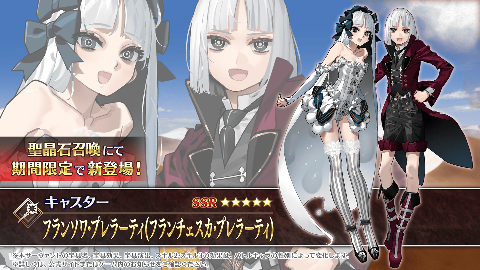 新登場の期間限定サーヴァント「★5(SSR)フランソワ・プレラーティ(フランチェスカ・プレラーティ)」を含む2騎と期間限定概念礼装3種をピックアップした聖晶石召喚を開催いたします。