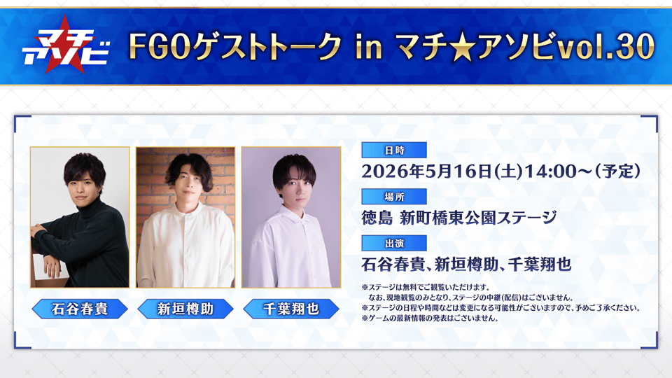 2026年5月16日(土)・17日(日)に開催されるマチ★アソビvol.30にて「Fate/Grand Order」のトークイベントを開催することが決定いたしました。