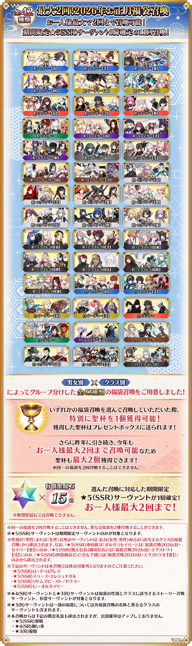 【お正月ならではのキャンペーン】 [期間限定]お年玉ログインボーナス! [期間限定]期間限定サーヴァント「★5(SSR)ロード・ログレス」が新登場! [期間限定]ロード・ログレスの体験クエストを開催! [期間限定]最大2回!有償聖晶石15個で召喚可能な「福袋召喚」を開催! [期間限定]10万リポスト達成でお正月限定概念礼装&2,026万QPプレゼント! [期間限定]7日間にわたって日替りで豪華報酬をプレゼント! [期間限定]連続ログインボーナスに「おみくじボーナス」が登場! [期間限定]お正月特別パネルミッションを開催! [期間限定]魔術礼装「ウィンターカジュアル」獲得クエストが再登場! [期間限定]デイリーミッションお正月限定版を開催! [期間限定]【お正月2026交換券】が手に入る限定ミッションを追加! [期間限定]スタートダッシュログインボーナスの一部報酬が2倍! [期間限定]カムバックログインボーナス! [期間限定]マイルームを特別なお正月仕様に変更!