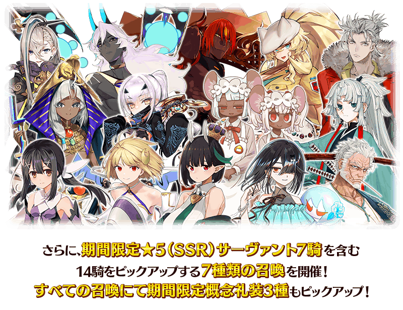 さらに、期間限定★5(SSR)サーヴァント7騎を含む14騎と期間限定概念礼装3種をピックアップする7種類の召喚を期間毎に切り替わりで開催いたします!