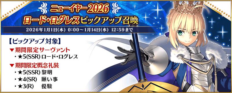 2026年を迎えたことを記念して、新登場の期間限定サーヴァント「★5(SSR)ロード・ログレス」と期間限定概念礼装3種をピックアップ!