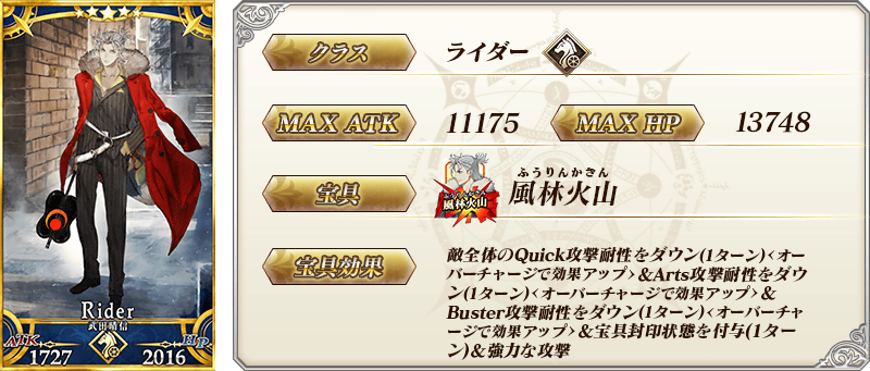 ※「★5(SSR)武田信玄(武田晴信)」は、「★5(SSR)武田晴信」を霊基再臨第3段階にすることで名称が「★5(SSR)武田信玄」に変化します。
