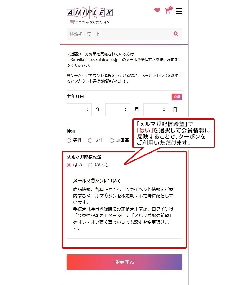 ・『アニプレックス オンライン』の「メルマガ配信希望」の登録