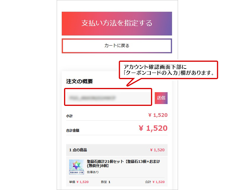1.聖晶石購入の手続きを進めて「アカウント確認画面」まで進む 2.画面下部にある「クーポンコードの入力」欄にクーポンコードを入力する ※PC等でのご購入の場合、画面右に入力欄が表示されます。 3.クーポンコードを入力したあとに横の「送信」ボタンを押す