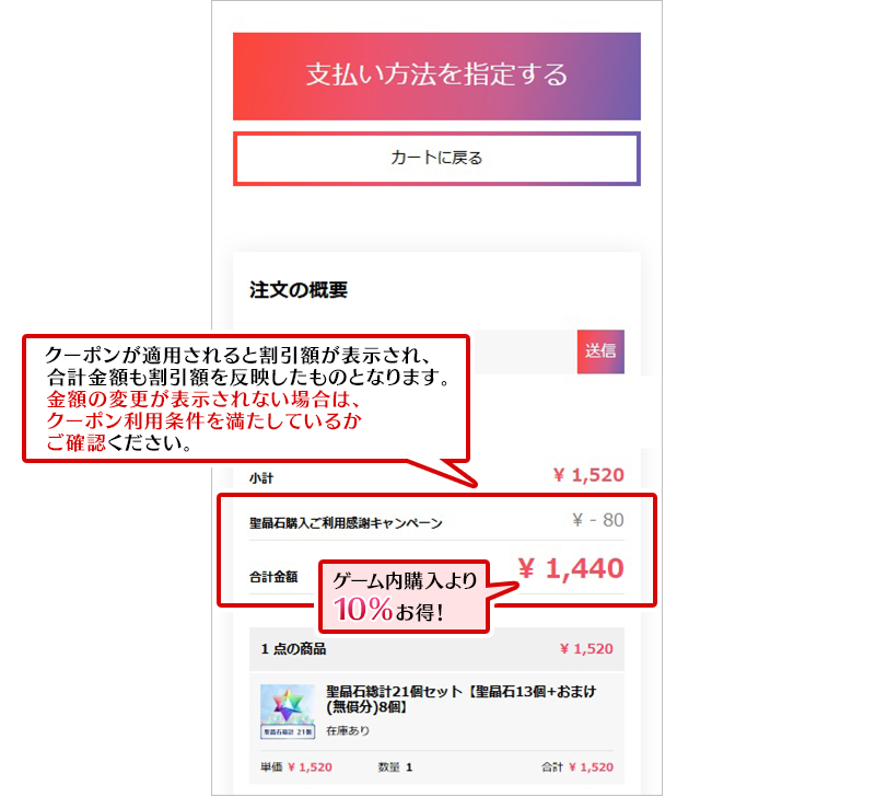 4.クーポン利用条件を達成しているとクーポンによる「5%OFF」が適用されます 5.クーポンによる割引が適用されたのを確認したら聖晶石購入手続きにそって購入を進める ※割引額が画面上に表示されない場合は、クーポンが正常に適用されておりません。必ずクーポンによる割引が適用されたことをご確認ください。