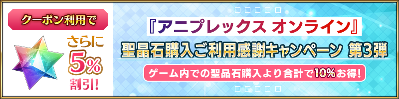 ※「合計10%OFF」は、『アニプレックス オンライン』での聖晶石購入時に適用される通常の「5%OFF」に本キャンペーンのクーポンによる「5%OFF」を加えた数値となります。 ※クーポンコードの利用はおひとり様1回のみ、割引後の購入価格50,000円までを上限とした割引が適用されます。 ※聖晶石のご購入の際は、『Fate/Grand Order』とアカウント連携済みの『アニプレックス オンライン』アカウントでのログインが必要となります。 ※購入エラーとなった場合、再度クーポンを使用するには時間がかかります。期限に余裕を持ってご使用ください。